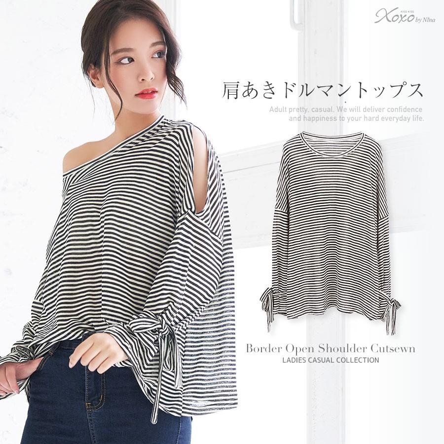 Tシャツ レディース カットソー トップス 肩出し 肩あき カットソー 長袖 リボン ドルマン フェミニン 袖フレア ブラック ボーダー ドルマントップス Nbct958 パーティードレスretica 通販 Yahoo ショッピング